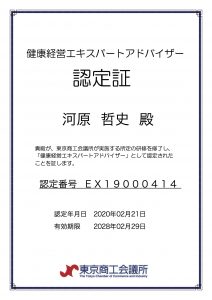 健康経営エキスパートアドバイザー認定証